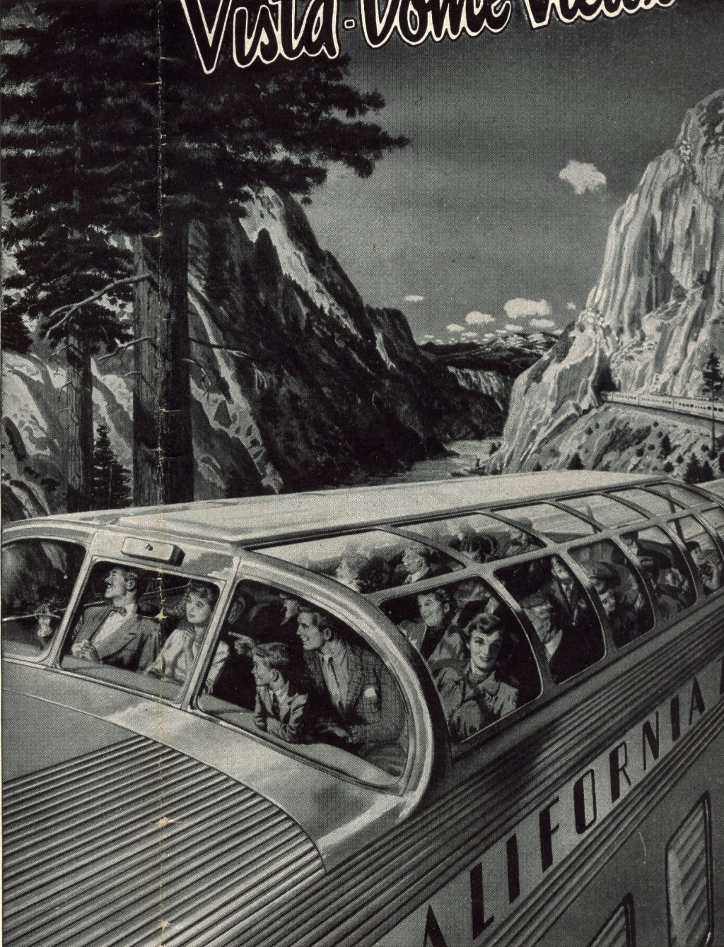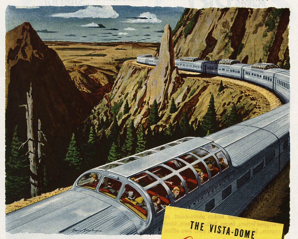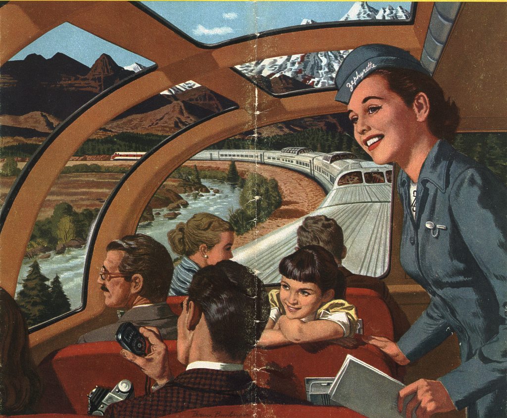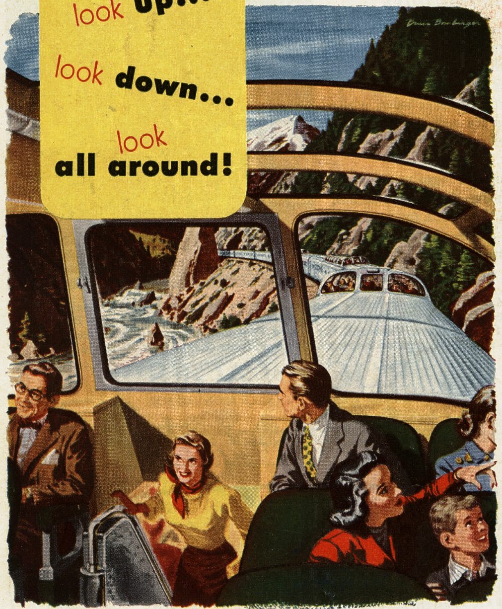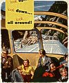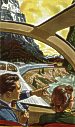 From a magazine ad. Here, Bomberger exaggerated the height of the inside of the dome in order to emphasize the wide-open feelings that the passengers experience. | |