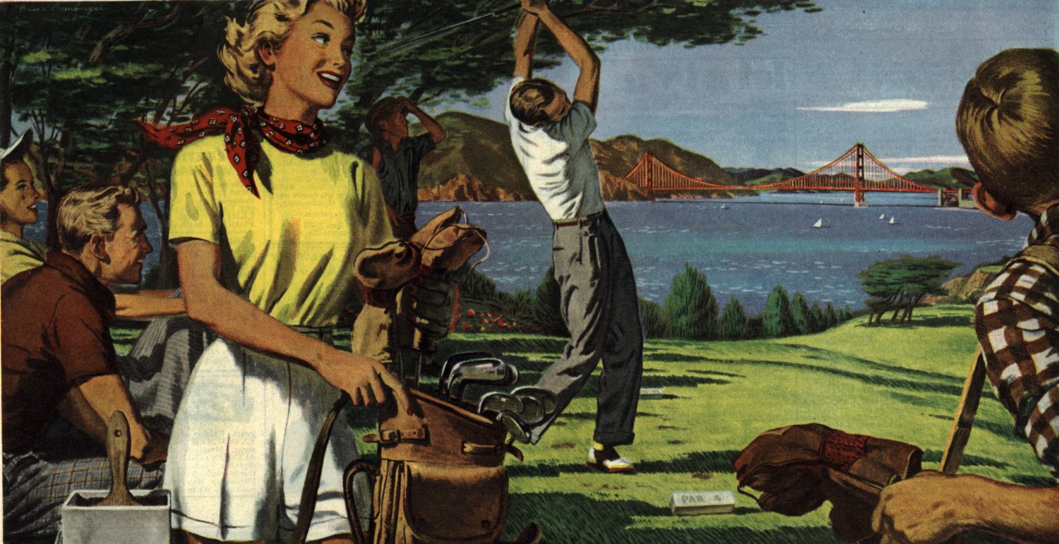 One of the earliest of Bomberger's CZ paintings is this one for a February 1949 magazine ad. Though based in San Francisco and thereby presumably familiar with its environs, Bomberger takes creative liberties with the locale...for this scene to be possible, the tee for this hole is floating on an island outside of the Bay (the giveaway is Ft Point under the Golden Gate bridge). | |