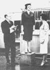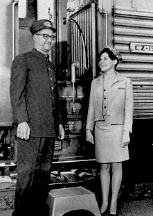 (Left)Zephyrette Mary Louise Gordon is seen here in a 1959 photo. (Right) Ready to begin her return trip from Oakland to Chicago, Zephyrette Nancy Gephart and Sleeping Car Porter Henry F. Wellington await CZ passengers. Ms. Gephart's uniform is the stlye used in 1969. WP Mileposts photos |
