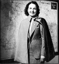 When the Burlington decided to introduce an overnight Zephyr between Chicago and Denver, it was decided to hire a group of young ladies to be hostesses. These girls would be college graduates, and would be responsible for working throughout the train with the conductor, making themselves helpful and generally agreeable with the passengers. They would make announcements, arrange for bridge games in the parlor car, send wires and take dinner reservations for the diner. Burlington's management clearly recognized that their new trains were the future of passenger railroading, and their customers wouldn't just be businessmen. The future lay in attracting and accommodating families, and a woman's touch in the management of the passenger trains would be essential for accomplishing this. So the Burlington hired Velma McPeek. McPeek graduated from the teacher's preparation program in Kingman High School, Kingman Kansas, in 1911, attended Southwestern College and was graduated from the Winfield College of Music. She taught for a while but decided that was not the life for her. A course at the School of Domestic Arts and Sciences in Chicago led her to where the Burlington found her, managing a tea room at a department store. As Burlington's Supervisor of Passenger Train Services, McPeek was completely responsible for the development of the concept of the Zephyrettes for the Denver Zephyr in 1936, and the Twin Cities Zephyr soon after. The first uniforms were gray man-tailored suits with a red, silk-lined cape for the winter and light-weight white silk suits over navy blouses for the summer.